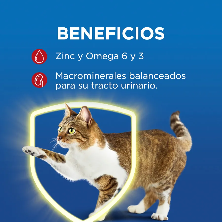 Harinas proteicas de origen animal (pollo, res y/o cerdo), maíz, concentrado proteico (de soya y/o de maíz), harina de pescado y/o harina de alga (Schizochytrium ssp.) como fuente de ácidos grasos omega 3, trigo, arroz, grasa (vacuna y/o porcina y/o avícola y/o de pescado y/o vegetal) como fuente de ácidos grasos omega 6, pirofosfato tetra sódico (TSPP), hidrolizado a base de hígados de pollo y/o cerdo, vegetales deshidratados (arveja, tomate), sal, cloruro de potasio, ácido fosfórico y/o bisulfato de sodio, carbonato de calcio y/o fosfato bicálcico, vitaminas [A, B1, B2, B3, B5, B6, B7, B9, B12, C, D3, E, K3], cloruro de colina, inulina (prebiótico), minoácidos (lisina, metionina, taurina), minerales [sulfatos: (manganeso, hierro, cobre, zinc), proteinatos y/o glicinatos: (manganeso, hierro, cobre, zinc, selenio), yodato de calcio o potasio, selenito de sodio], colorantes naturales.