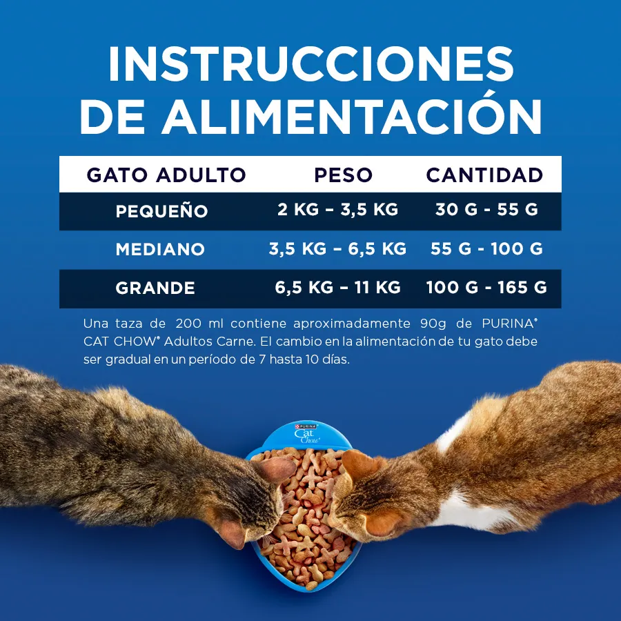Conoce CAT CHOW® sabor carne, una mezcla deliciosa de sabor que le encantará a tu gato. ¡Nutrición completa y sabor en cada bocado! Ofrece los nutrientes que los gatos necesitan para mantenerse fuertes y saludables. Contiene carne naturalmente rica en hierro, que los ayuda a desarrollar músculos fuertes. Alimento completo para gatos adultos de todas las razas.