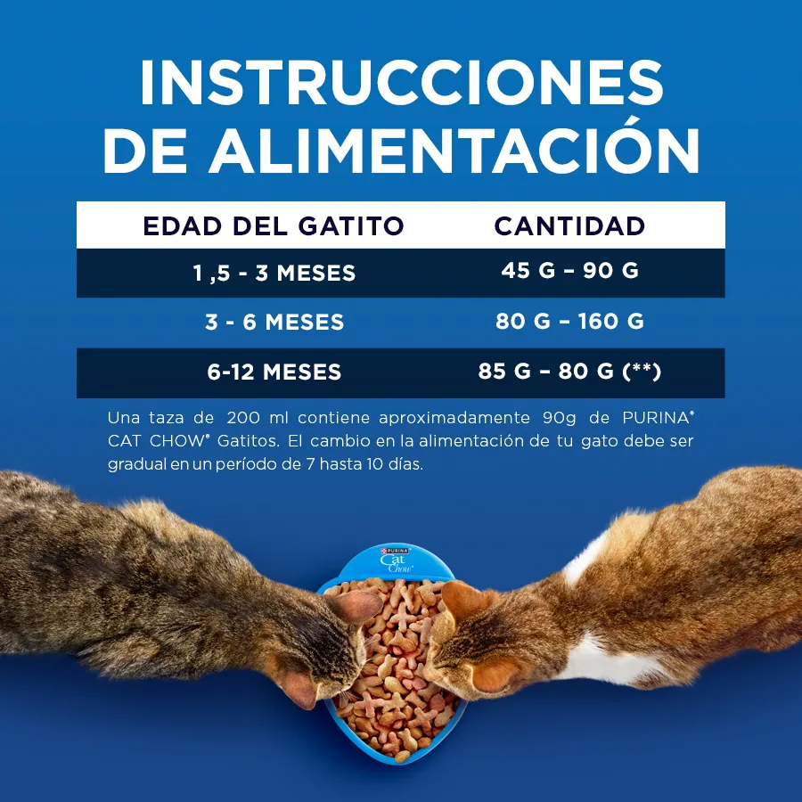 *Una taza de 200 ml contiene aproximadamente 90 g de PURINA® CAT CHOW® Gatitos Pescado, Carne y Leche. A partir de las 6 semanas de edad los gatos pueden comer la ración humedecida con agua. Añada 1 parte de agua por cada 3 partes del producto y reduzca gradualmente la cantidad de agua hasta que el gato coma el alimento completamente seco. Si el alimento es humedecido, descartar la porción no consumida. Ofrezca la cantidad diaria recomendada de PURINA® CAT CHOW® Gatitos Pescado, Carne y Leche dividida en dos porciones durante el día y deje a su gato comer cuando desee. La cantidad diaria recomendada debe ser ajustada dependiendo de las condiciones ambientales, del nivel de actividad del gato y de su condición física. ** En la transición a adulto, las necesidades calóricas de los gatos disminuyen. Ajuste la cantidad de alimento para mantener una condición corporal ideal y evitar el exceso de peso.