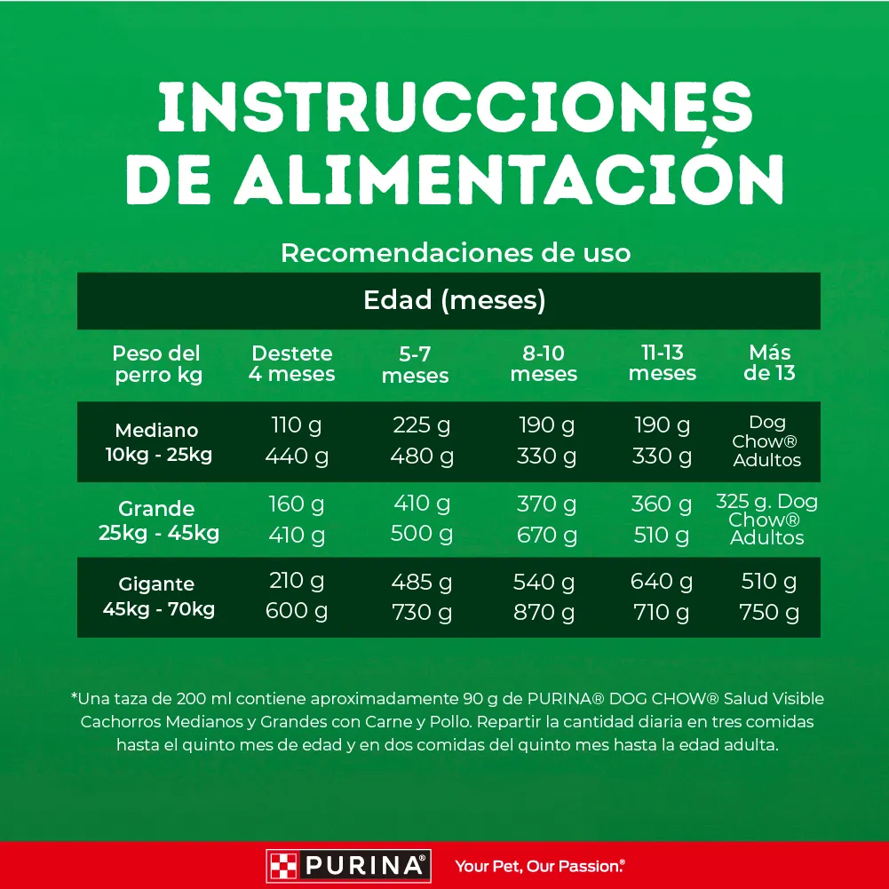 HEMBRAS LACTANTES: A lo largo de toda la lactancia, suministrar PURINA® DOG CHOW® GRAN COMIENZO® Cachorros Medianos y Grandes de 2 a 4 veces la cantidad de PURINA® DOG CHOW® Adultos Medianos y Grandes que consumía antes de la gestación. En caso necesario, divida la cantidad recomendada a lo largo del día y ajústela para mantener una buena condición física.