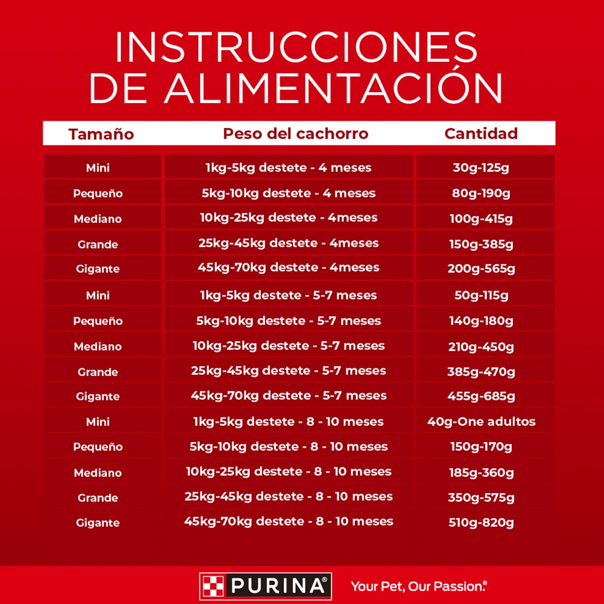 Destete- 4 meses (100-415g) / 5-7 meses (210-450g) / 8-10 meses (185-360g) / 11-13 meses (180-305g)