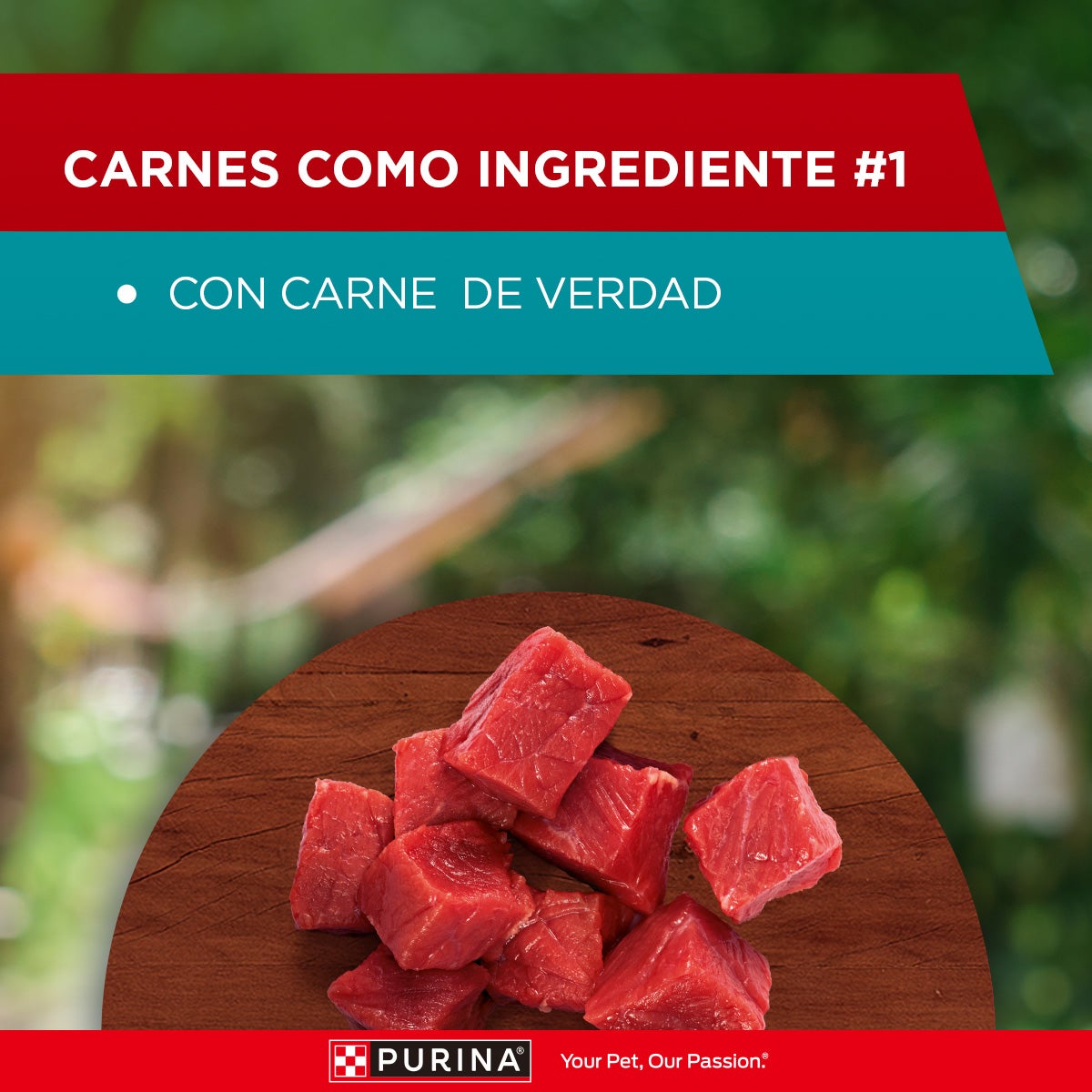 Agua suficiente para proceso, carne y/o carcasa de pollo congeladas, gluten de trigo, hígado de cerdo y/o hígado de pollo y/o vísceras de cerdos congelados, carne de res congelada, concentrado proteico de soya, almidón de máiz, goma xantana, goma de algarrobo, goma guar, subproductos de salmón congelados, glicina, carbonato de calcio, dextrosa, pirofosfato tetrasódico y/o difosfato trisódico, cloruro de potasio, vitaminas (A, D3, E, K3, B1, B2, B3, B5, B6, B7, B9, B12, cloruro de colina), taurina, fosfato bicálcico, sal, minerales [(sulfatos: zinc, hierro, manganeso, cobre), (proteinatos: zinc, hierro, manganeso, cobre, selenio), yodato de calcio, selenito de sodio], colágeno hidrolizado, harina de alga (Schizochytrium sp. ).