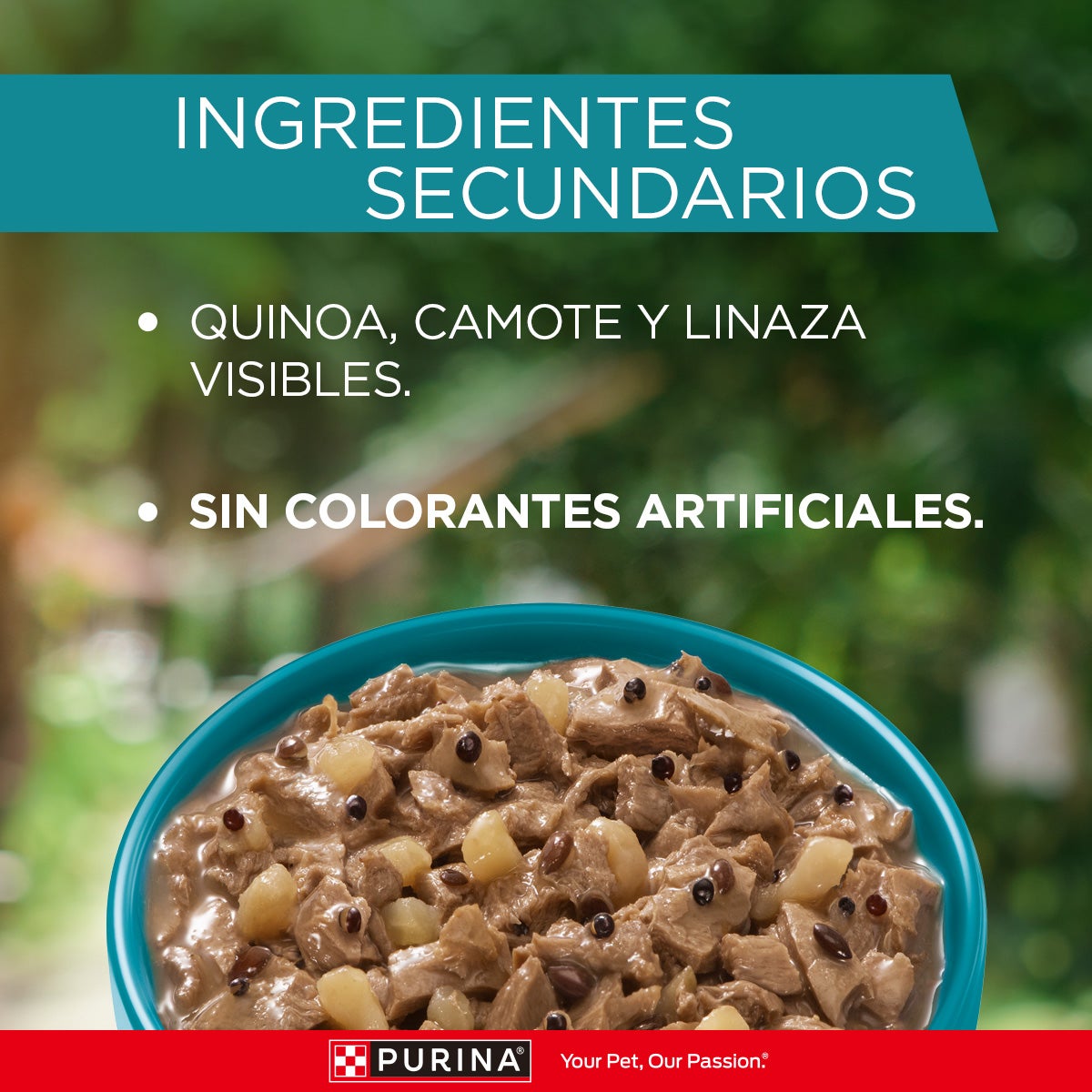 Alimento húmedo completo y balanceado apto para todas las etapas de vida, con exquisito sabor. Contiene quinoa, camote y linaza, alimentos de alta densidad nutricional que traen beneficios a la salud y el bienestar de tu gato.