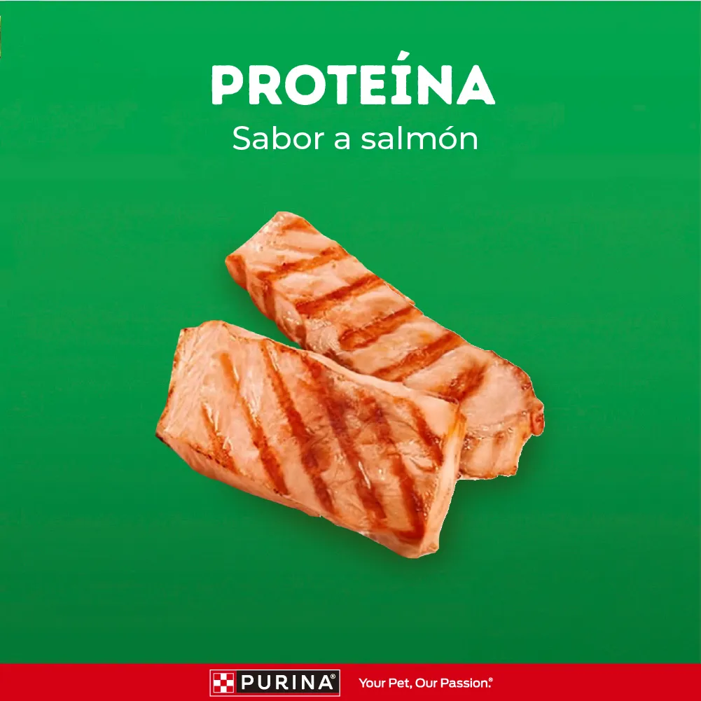 Agua suficiente para proceso, gluten de trigo, carcasa de pollo y/o visceras de pavo, higado de pollo y/o visceras de cerdo, carne de salmon, carne de pollo, concentrado proteico de soja, almidon de maiz, fosfato dicalcico, sal, carbonatao de calcio, cloruro de potasio, suplementos vitaminicos A, D3, E, B1, B2, B3, B5, B6, B9, B12, cloruro de colina, suplementos minerales sulfato de zinc, proteinato de zinc, sulfato ferroso, sulfato de manganeso, proteinato de manganeso, sulfato de cobre, proteinato de cobre, yotadto de calcio, selenito de sodio, dioxido de titanio, oxido de hierro rojo, colorante caramelo, oxido de hierro amarillo.