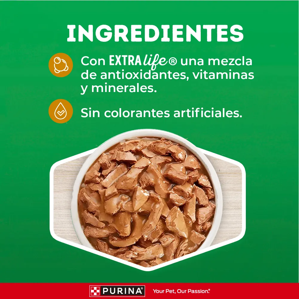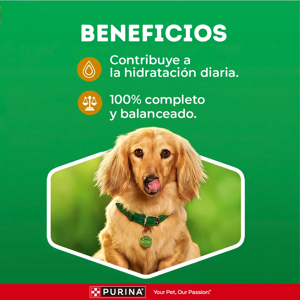 Alimento húmedo Premium Dog Chow sabor salmón para perros adultos minis y pequeños, añade aún más vida a la vida y contribuye a su hidratación diaria. Una receta con sabrosos trocitos de carne ideal para su alimentación y preparado con ingredientes de alta calidad.