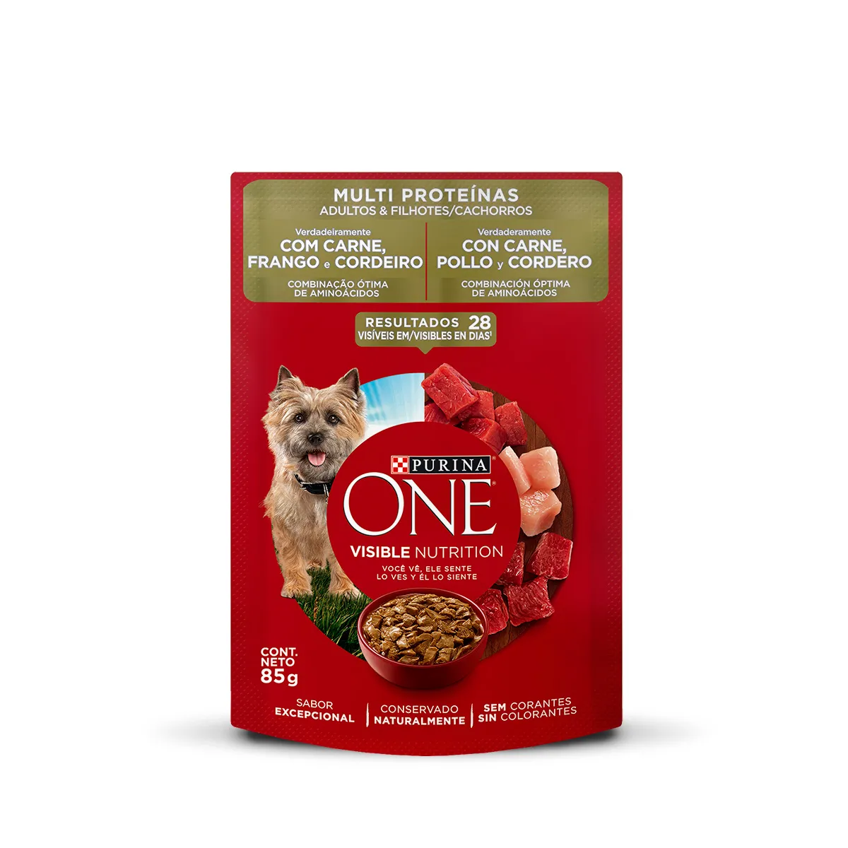 Alimento Húmedo para Perros Purina One Adulto y Cachorro Multiproteínas con Carne, Pollo y Cordero Pouch